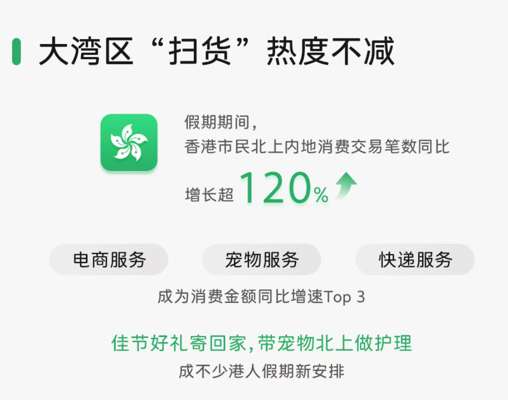 据南边+记者了解到,粤港澳大湾区不单是是最热点的旅游推敲地,同期亦然出游热度最高的地区。其中香港住户更是通过“拼假”北上过节。WeChat港币钱包数据泄露,香港市民北上内地破钞往复笔数同比增长超120%。港东说念干线上线下扫货热度不减,电商处事、宠物处事、快递处事成破钞金额同比增速Top 3。此外,不雅看文娱上演及赛事成十一本领香港市民北上自在文娱破钞增速最快的名堂。
