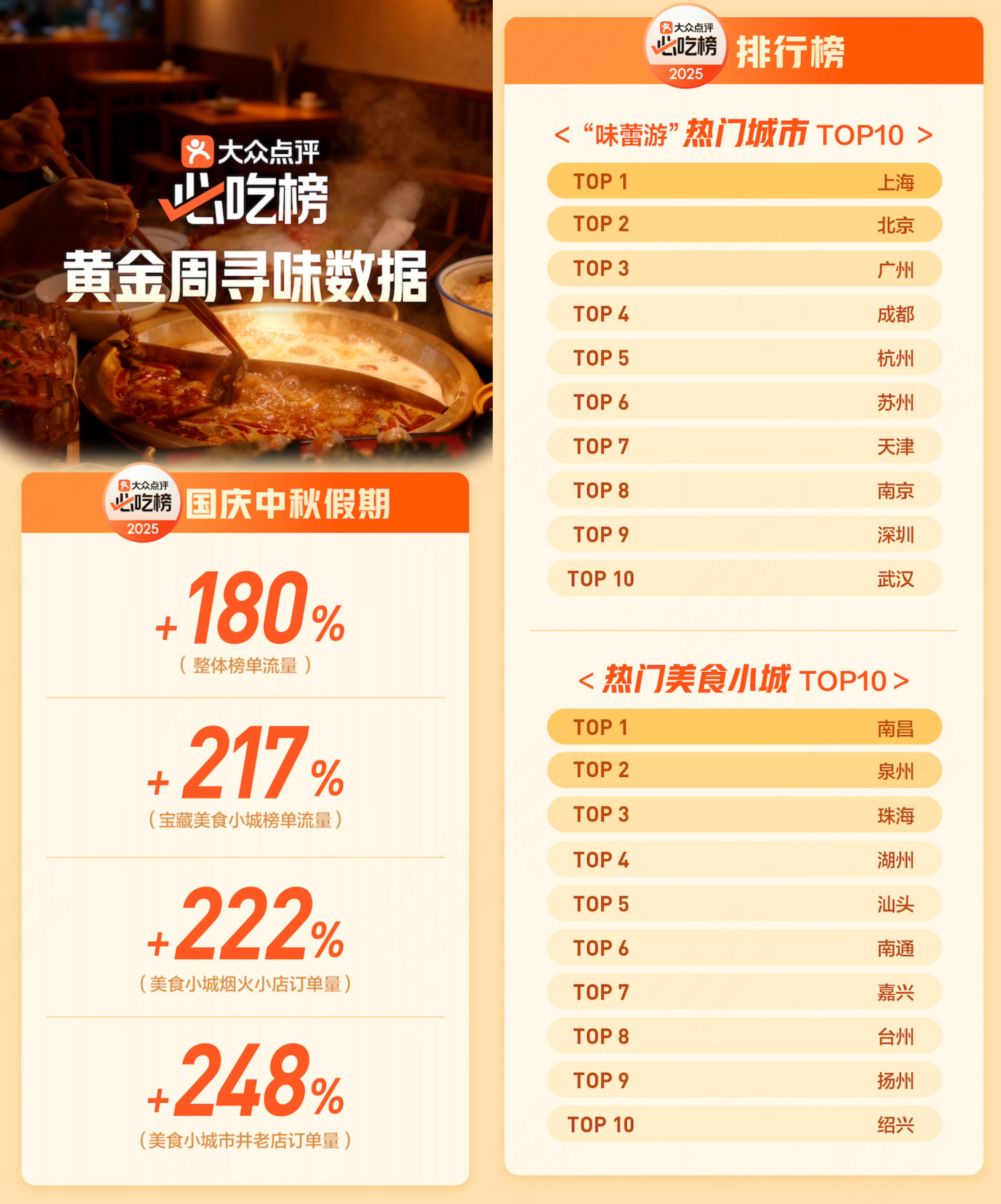 各人点评数据泄露,10月1-8日,隐讳宽阔“必吃榜”等高分堂食餐厅的“品性外卖”他乡用户流量环比节前增长近165%,其中广州和深圳照旧“外卖味蕾游”热点城市TOP10的前两位。双节本领,更多元的“味蕾游”玩法,给各地餐厅营业带来了新增长。