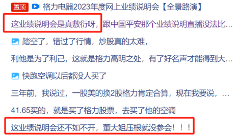 事实上,格力电器在2023年6月举行的2022年度网上功绩讲明会雷同也所以董秘邓晓博翰墨回复的体式举行。但在前几年,格力电器多以视频直播的边幅举办,董明珠本东说念主也出席并回答部分发问。对此,有投资在有关社区平台对董明珠缺席功绩讲明会抒发了不悦,直言“依稀”。