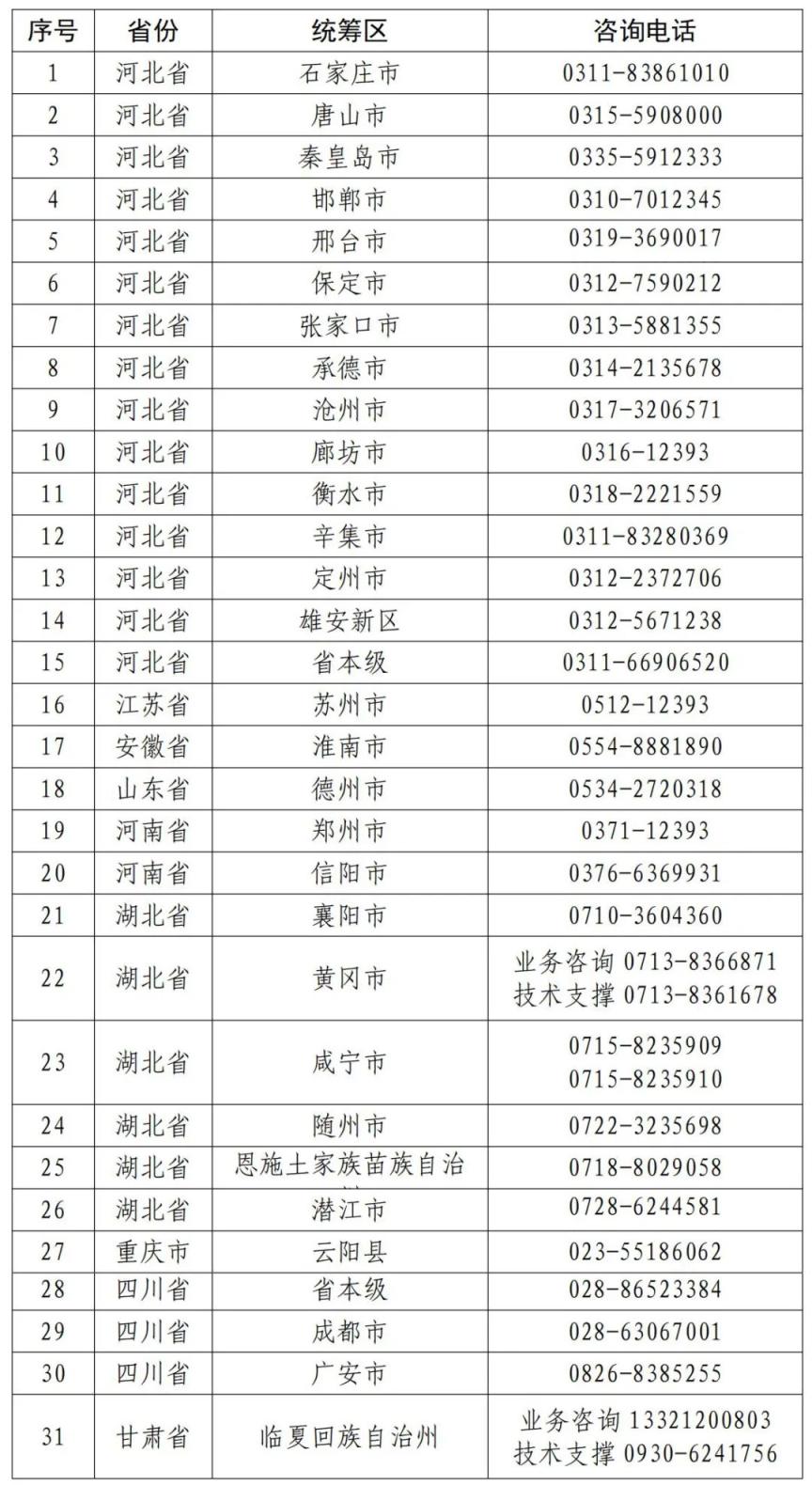 河北省(石家庄市、唐山市、秦皇岛市、邯郸市、邢台市、保定市、张家口市、承德市、沧州市、廊坊市、衡水市、辛集市、定州市、雄安新区、省本级)、江苏省(苏州市)、安徽省(淮南市)、山东省(德州市)、河南省(郑州市、信阳市)、湖北省(襄阳市、黄冈市、咸宁市、随州市、恩施土家眷苗族自治州、潜江市)、重庆市(云阳县)、四川省(省本级、成王人市、广安市)、甘肃省(临夏回族自治州)共31个地区(统筹区)已通畅个东说念主账户跨省共济使用。