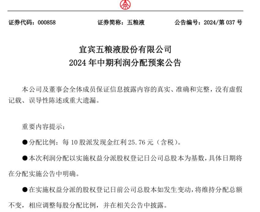 11月28日晚,五粮液发布公告暗示,公司拟履行中期利润分拨预案,拟向整体鼓动每10股派发现款红利25.76元(含税),共计拟派发现款红利100亿元(含税)。罢了本年9月30日,五粮液未分拨利润为962.09亿元。