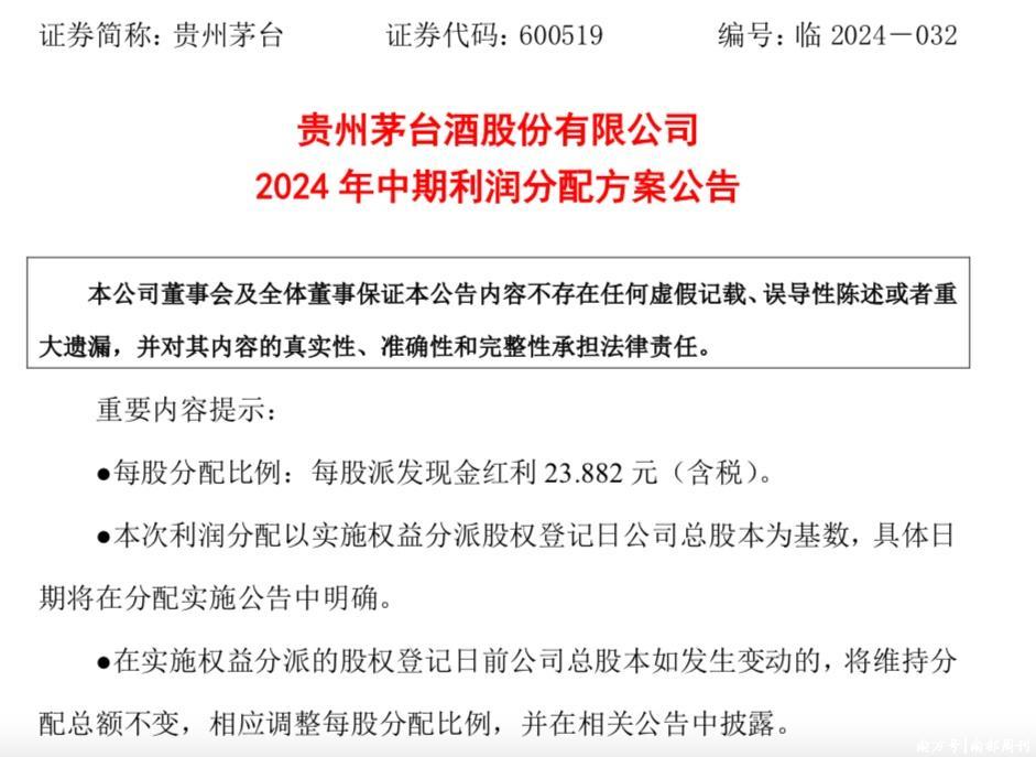据上述《计较》等践诺,每年度分拨的现款红利总和不低于昔日实现归母净利润的75%,原则上每年度进行两次分成。其中,公司将进行2024年中期利润分拨,每股派发现款红利23.882元(含税),共计拟派发现款红利超300亿元(含税)。