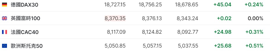 2. 适度发稿,德国DAX指数涨0.24%,英国富时100指数涨0.00%,法国CAC40指数涨0.31%,欧洲斯托克50指数涨0.51%。